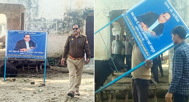 उझानी के गांव में ग्राम समाज की जमीन पर डाक्टर अम्बेडकर का लगाया बोर्ड, हुआ बबाल, पुलिस ने जांच कर हटवाया