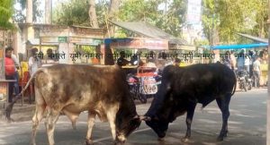गुरूवार की शाम चार बजे के करीब सबसे व्यस्त स्टेशन रोड पर कोतवाली के सामने अचानक दो आवारा सांड अपनी मूछ के लिए आपस में भिड़ गए। दोनों सांड करीब बीस मिनट तक एक दूसरे को अपनी ताकत दिखाते रहे जिससे स्टेशन रोड का आवागमन कुछ देर को रूक गया और अगर किसी ने निकलने का प्रयास किया तो सांडों ने उसकी हिम्मत तोड़ दी। दो सांडों को बीच सडक लड़ते देख ठेला खौमचें वालो ने पानी डाल कर भगाने का प्रयास किया मगर दोनों सांडों ने लड़ना बंद नही किया। बताते है कि दोनों सांड लड़ते रहे फिर अचानक एक सांड ने मैदान छोड़ दिया और पीछे की ओर भाग जिस पर दूसरे सांड ने उसका पीछा किया तब सांड ने राह चलती महिला-पुरूषों को रौंद दिया।