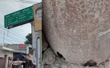 उझानी, (बदायूं) । नगर के मुख्य घंटाघर चैराहें पर लगा दिशा संकेत बोर्ड का पोल पूरी तरह से गल चुका...