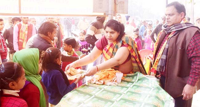 मकर संक्रांति के पर्व पर सुबह से नगर में उल्लास और धार्मिक आस्था का माहौल देखने को मिला। घरों में महिलाओं ने विशेष रूप से भगवान सूर्य और देवी देवाताओं की पूजा अर्चना की फिर गरीबों को खिचड़ी, गजक, तिल, गुड आदि का भोग लगा कर प्रसाद समेत गरीबों को दान पुण्य किया। इस अवसर पर नगर के कई स्थानों पर भण्डारे आयोजित किए गए जिसमें प्रसाद खिचड़ी का वितरण किया गया। भाजपा नेता प्रदीप गोयल ने भी अपने आवास पर खिचड़ी भोज का आयोजन किया। श्री गोयल ने नागरिकों में खिचड़ी के प्रसाद का वितरण कराया।
