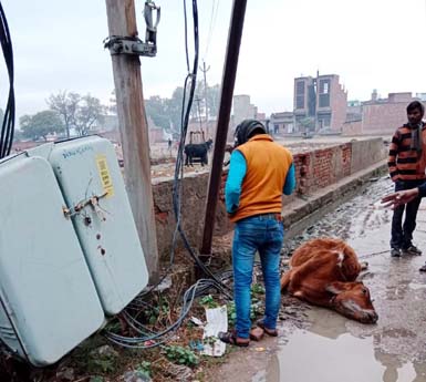 बिल्सी,(बदायूं)। नगर के मोहल्ला संख्या छह में गौशाला रोड पर लगे ट्रांसफार्मर की केविल से टकराने पर एक गौवंश की मौत हो गई। बाद में मोहल्ले के लोगों ने गाय को भूमि में दफना दिया।