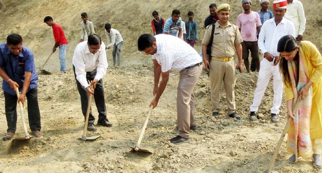 गुरुवार को जिलाधिकारी दीपा रंजन ने मुख्य विकास अधिकारी ऋषिराज, सीवीओ डॉ. अरुण कुमार जादौन, डीपीआरओ श्रेया मिश्रा, डीसी मनरेगा सहित अन्य अधिकारियों के साथ नारियल तोड़कर, हवन पूजन कर, नींव में ईट रखकर एवं फावड़ा चलाकर विकासखण्ड जगत अन्तर्गत अमृत सरोवर योजना का शुभारंभ किया। इस योजना के तहत जनपद के प्रत्येक विकासखण्ड में पांच-पांच, सभी ब्लॉकों में कुल 75 तालाब खुदवाए जा रहे हैं। इस अवसर पर डीएम व सीडीओ ने स्वयं भी श्रमदान किया। मनरेगा के तहत जिले में तालाबों की खुदाई कराई जा रही है। अधिकारियों ने तालाब में चल रहे खुदाई कार्य को देखा। डीएम ने ग्राम प्रधान को निर्देश दिए कि अधिक से अधिक श्रमिक लगाकर नहर खुदाई का कार्य जल्द पूर्ण कराएं। कार्य करने वाले सभी श्रमिकों के मनरेगा जॉब कार्ड अवश्य बनवाए। इसमें श्रमिकों की संख्या बढ़ाई जाए इसके अलावा महिलाओं की सहभागिता पर विशेष जोर दिया जाए। इस दौरान अधिकारियों ने तीखी धूप के बीच स्वयं श्रमदान किया। डीएम ने अधिकारियों को निर्देश दिए कि तालाब की देखरेख को वह पूरी तरह से सजग रहें। उन्होंने ग्रामीणों से तालाब के जल को गंदा न करने की अपील की है।