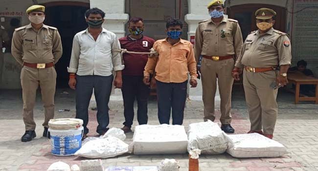 उझानी, (बदायूं)। कोतवाली पुलिस ने अलीगढ़ में जहरील शराब से बड़ी संख्या में हुई जनहानि से सबक लेते हुए क्षेत्र में नकली शराब के कारोबारियों पर अपना शिकंजा कस दिया है। पुलिस ने शुक्रवार को ब्लाक क्षेेत्र के गांव नगला तैयबपुर में आबकारी विभाग के साथ छापामारी कर देशी शराब में यूरिया मिला कर नकली शराब बना रहे तीन युवकों को रंगे हाथों गिरफ्तार कर लिया है। पुलिस ने मौके से भारी मात्रा में बार कोड, देेशी शराब के पौआ, खाली ढक्कन और यूरिया बरामद की है। पुलिस ने आज तीनों युवकों से पूछताछ करने के बाद चालान कर अदालत में पेेश किया जहां से तीनों को जेल भेज दिया गया है।