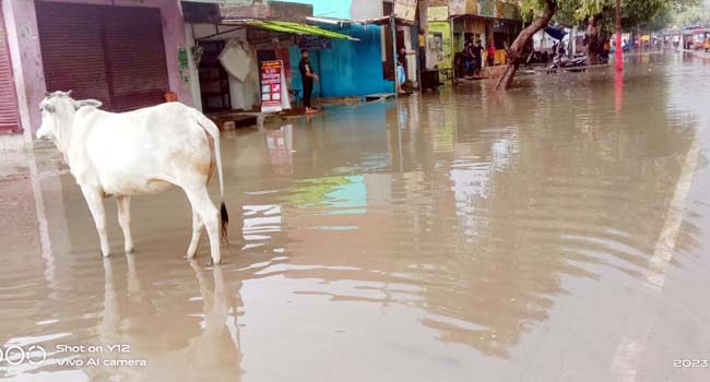 झमाझम बारिश के चलते पूरा नगर पानी के आगोश में चला गया था। सबसे खराब स्थिति निचले इलाकों की थी जहां के मकान और दुकानों मंे कई फिट तक पानी भर गया था। लोग घरों-दुकानों मंे भरे पानी को निकालने की जद्दोजहद में जुटे नजर आ रहे थे।
