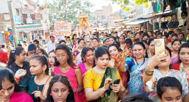 शाम को बैंडबाजों से सजी महावीर स्वामी की शोभायात्रा धूमधाम और भव्यता के साथ जैन मंदिर से निकाली गई। शोभायात्रा में शामिल जैन समाज के नर-नारी और बच्चें अहिंसा परमोधर्म के जयघोष को गुंजायमान करते हुए भजन कीर्तन कर रहे थे। शोभायात्रा में शामिल नर-नारी भगवान महावीर की भक्ति में भाव विभोर होकर नृत्य करने से खुद को नही रोक सके। रथ यात्रा में चेयरपर्सन श्रीमति पूनम अग्रवाल, पूर्व मंत्री विमल कृष्ण अग्रवाल, नगर उपाध्यक्ष सचिन अग्रवाल सहित गणमान्य नागरिक शामिल हुए। रथ यात्रा में अनूप जैन अध्यक्ष, रजनी जैन महिला मंडल अध्यक्ष, जयदीप जैन मंत्री,अभिषेक जैन, अजय जैन, अरुण जैन, मनोज जैन, कुलदीप जैन, प्रदीप जैन, पम्मो जैन, निखिल जैन, बॉबी जैन, विनीत जैन, पिंकुल जैन, सतीश जैन, संचित, शशांक, संगीता जैन, मनका जैन,प्रतिज्ञा, एकता, आध्या,प्राची, अनामिका, बीनू, प्रतिभा,गार्गी, मोनिका, सीमा, रुचि, कृति एवम समस्त जैन समाज का महत्त्वपूर्ण सहयोग रहा