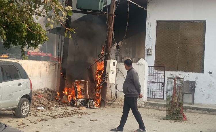 उझानी( बदायूं)। कोतवाली परिसर में लगे ट्रांसफार्मर और मीटरों में केबिल में हुए फाल्ट से आग लग गई। आग लगने से अफरा तफरी मच गई और पुलिस कर्मियों ने नागरिकों की मदद से मिट्टी तथा पानी डाल कर आग पर काबू पाया।