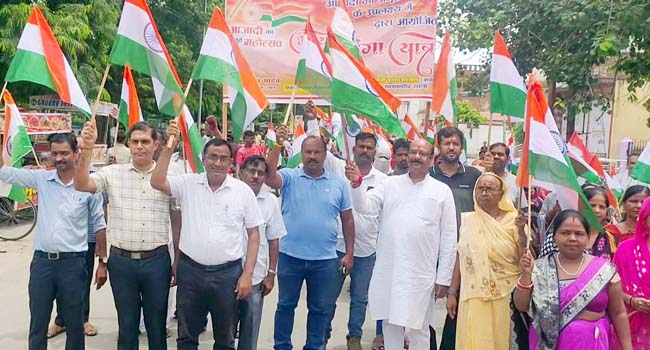 गुरूवार को सुबह से नगर चहूं ओर वंदे मातर्म और भारत माता की जय से गुंजायमान हो उठा। प्रातः काल से नगर पालिका परिषद के कर्मी दुकान-दुकान तिरंगा झंडा का वितरण करने में लगे हुए थे। प्रत्येक समुदाय के नागरिकों ने झंडा मिलने के बाद उसे अपने प्रतिष्ठानों पर शान से लहराने के लिए लगा दिया जिससे नगर के मुख्य बाजार देश की आन-बान और शान से जगमग हो गए। इधर नगर के अशर्फी देवी कन्या इंटर कालेज समेत विभिन्न स्कूल कालेजों के बच्चों ने तिरंगा लहराते और भारता माता की जयघोष को गुंजायमान करते हुए नगर में तिरंगा यात्रा निकाली और नागरिकों को राष्ट्रीय ध्वज के प्रति जागरूक किया। दोपहर में नगर पालिका परिषद से चेरयपर्सन पति पूर्व मंत्री विमल कृष्ण अग्रवाल के नेतृत्व में सभासदों के अलावा पालिका कर्मियों ने शान से तिरंगा लहराते हुए नगर में तिरंगा यात्रा निकाली। तिरंगा यात्रा पूरे नगर में भम्रण करती हुई पालिका प्रांगण में समापन हुई जहां पूर्व मंत्री श्री अग्रवाल, ईओ जेपी यादव और सफाई निरीक्षक हरीश त्यागी ने देश को आजादी दिलाने वाले शहीदों को याद करते हुए उन्हें नमन किया। तिरंगा यात्रा के दौरान पूर्व मंत्री समेत पालिका अधिकारियों ने नागरिकों से अपने घरों में राष्ट्रीय ध्वज को शान से लहरानने का आह्वान किया। आजादी के अमृत महोत्सव पर नागरिकों में राष्ट्रीय ध्वज को अपने घरों पर लहराने का जज्बा पैदा होने लगा है। इधर होमगार्डो ने पूरे नगर में विश्व विजयी तिरंगा प्यारा, झंडा ऊंचा रहे हमारा और भारत माता की जय के घोष को गुंजायमान करते हुए शान से तिरंगा लहराते हुए यात्रा निकाली।