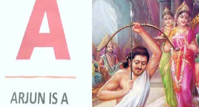 प्रिंसिपल साहेब लाल मिश्रा ने बताया कि हमारे वर्णमाला चार्ट में अर्जुन के लिए है तो हमने एक प्रतीकात्मक फोटो भी लगाई है. ताकि बच्चे इससे रिलेट कर सकें और समझ सकें कि अर्जुन महाभारत का महान योद्धा है. इस फोटो के साथ ही उसका ऐतिहासिक और पौराणिक महत्व भी बताया गया है. उदाहरण के लिए, अर्जुन को एक ‘महान योद्धा’ और चाणक्य को ‘आदर्श शिक्षक’ के रूप में वर्णित किया गया है. बच्चों को अंग्रेजी के अन्य शब्द और व्याकरण भी पढ़ाई जा रही है।