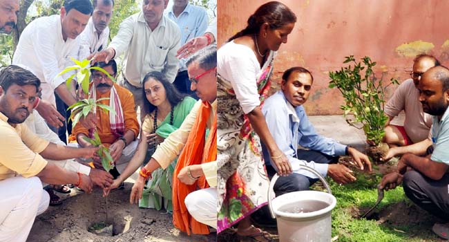 वजीरगंज(बदायूं)। विश्व पर्यावरण दिवस पर देवी मेला प्रांगण में सदर विधायक महेश चंद्र गुप्ता तथा पंचतंत्र फाउंडेशन वाटर वूमेन की संस्थापक शिप्रा पाठक ने सयुंक्त रूप से छायादार और औषद्यिय पौधें रौंप कर उनके बड़े होने तक देखभाल की शपथ ली।
