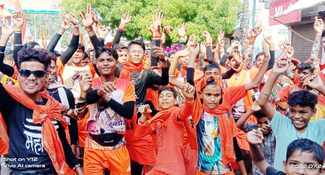 बड़ी संख्या में दूर दराज के जनपदों के शिव भक्त काबंड़ उठा कर अपने आरध्य महादेव का जलाभिषेक करने के लिए सावन माह के पहले दिन से ही निकल रहे है। सावन के दूसरे सोमवार को शिवभक्त काबंड़ियों का नगर से गुजरने का सिलसिला अनावरत रूप से जारी रहा। भगवान शिव की भक्ति की शक्ति से लबारेज काबंड़ियों की टोलियां विशेषकर युवाओं की टोलियां अपने साथ चल रहे वाहनों पर बज रहे भजनों पर जमकर थिरकतें हुए नगर से निकले तो नागरिक भी खुद को नही रोक पाए और उन्होंने शिव भक्तों का मनोबल बढ़ाने के लिए महादेव के जयघोष को गुंजायमान कर दिया। शिव भक्तों की टोलियों के चलते चहूं ओर भक्ति का माहौल बन गया है।