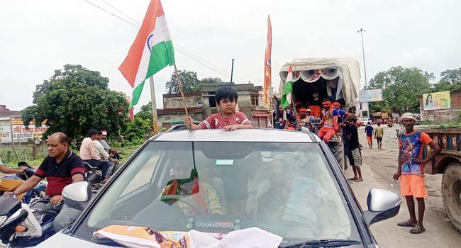 उझानी,(बदायूं)। श्रावण मास की काबंड यात्रा के दौरान शिव भक्तों में देश भक्ति का जज्बा सर्वोपरि रहा। शिव भक्तों के साथ देश की शान तिरंगा लहराता हुआ चल रहा था जिससे हर नागरिक देश की शान तिरंगा को सैल्यूट करता नजर आ रहा था।