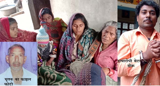 नगर के भर्राटोला इलाका की नई बस्ती निवासी पल्लेदार राजाराम उर्फ पारू को शनिवार की रात लगभग दस बजे उसके पुत्र वीरू ने पीट-पीट कर और सिर में ईंट मार कर मौत के घाट उतार दिया। बताते है कि परिजनों ने मौहल्लावासियों के सहयोग से पुलिस को सूचना दी तब पुलिस ने मौके पर नागरिकों के सहयोग से कड़ी मशक्कत के बाद उसे गिरफ्तार कर लिया। बताते है कि पुलिस और परिजनों ने राजाराम को जीवित मान कर उसे उझानी अस्पताल भेजा जहां से उसे जिला अस्पताल भेज दिया गया लेकिन वहां डाक्टरों ने उसे मृत घोषित कर शव मोर्चरी में रखवा दिया। घटनाक्रम की जानकारी देते हुए मृतक की पत्नी जशोदा ने बताया कि उसके बेटे वीरू पर पिछले पांच दिन से मानसिक गर्मी चढ़ गई थी जिससे वह घर में तोेड़फोड़ कर रहा था और घर में खाना तक नही बनने दे रहा था और परिवार के सदस्यों के साथ मारपीट कर रहा था। जशोदा ने बताया कि शनिवार की रात वीरू ने अपने बच्चों को कपड़ा उतार कर घर से बाहर खड़ा कर दिया और पत्नी के साथ भी मारपीट की तब उसके पति राजाराम ने उसका विरोध किया तो वीरू ने उसके साथ मारपीट शुरू कर दी। जशोदा का कहना है कि जब वह और उसकी बहुएं बचाने गई तो उसने सभी को पीटा। उसने बताया कि वीरू अपने पिता को पीटता रहा और फिर सिर र्में इंट मार दी जिससे उसकी मौत हो गई। पल्लेदार राजाराम की मौत पर परिवार में कोहराम मच गया है। हत्यारोपी बेटे के जेल जाने से उसके दो मासूम बच्चें और पत्नी बिलख रही है। पुलिस ने आज जिला अस्पताल पहुंच कर शव का पंचनामा भर कर पीएम कराने के बाद परिजनों को सौंप दिया है। इस मामले में पुलिस ने की तहरीर पर बेटे के खिलाफ मुकद्दमा दर्ज कर उसे जेल भेज दिया है। हत्यारोपी बेटे ने पुलिस हिरासत में बताया कि उसका पिता रोजाना शराब पीकर घर की महिलाओं समेत अन्य सदस्यों को मारता पीटता था जिससे तंग आकर उसने अपने पिता के साथ धक्का मुक्की की और वह ईंटों पर गिर गया जिससे उसकी मौत हो गई।