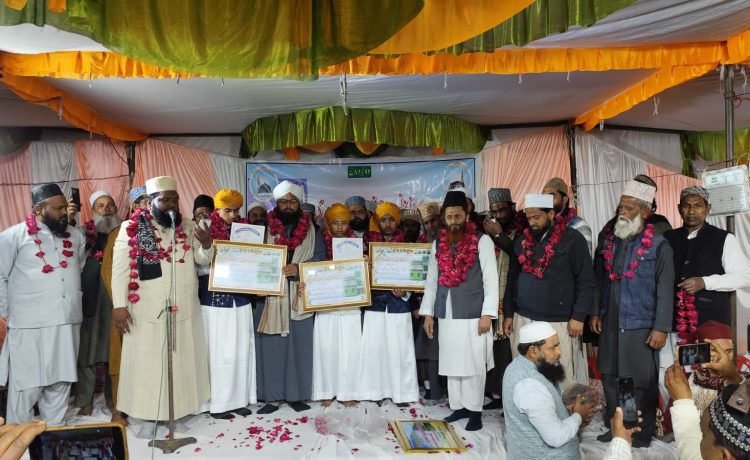 बिसौली। मदरसा फैजाने रजाए मुस्तफा में मदरसे के प्रिंसिपल मौलाना मो. इफ्तखार अशरफी की सरपरस्ती में अजमते कुरआन कॉन्फ्रेंस व जलसा ए दस्तार बन्दी कार्यक्रम आयोजित किया गया। जिसमें मदरसे से कुरान हिब्ज़ कर चुके मो. साहिल पुत्र असरार अहमद, मुशर्रफ हुसैन पुत्र रुस्तम खां एवं मो. सुब्हान पुत्र शकील सैफी हाफिज ए कुरान को मदरसे के प्रिंसिपल मौलाना मो. इफ्तखार अशरफी, जलसे के मुख्य अतिथि मुफ्ती नाजिम एहसानी मुरादाबाद, कारी जमशेद आलम अशरफी मुरादाबाद, मौलाना अकरम रजा नूरी, शायर ए इस्लाम कारी जुनैद जामी झारखंड आदि धर्मगुरुओं द्वारा पगड़ी बांधकर एवं प्रमाण पत्र देकर सम्मानित किया गया।