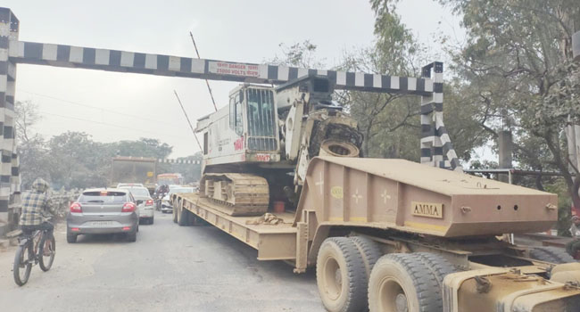 छतुईया रेलवे फाटक के ऐंगल में फ्लैटबेड ट्रेलर मशीन लदा ट्रक फसने से बीएम हाइवे हुआ जाम, एक घंटे तक परेशान रहे वाहन चालक