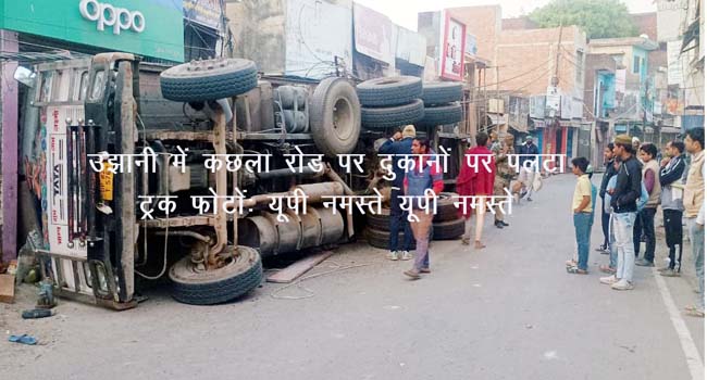 गुरूवार की तड़के लगभग साढ़े चार बजे के करीब सीमेंट से भरा ट्रक बदायूं की ओर जा रहा था। बताते हैं कि ट्रक चालक अपने वाहन को बाइपास से न ले जा कर नगर के अंदर से ले जा रहा था। बताते हैं कि तेज गति का ट्रक कछला रोड के मुख्य बाजार में पहुंचा तभी अचानक ऐसा क्या हुआ कि हलवाई चौक चौराहा पार करते ही ट्रक अनियंत्रित हो गया और कई दुकानों से लगता हुआ तीन दुकानों पर पलट कर जा गिरा जिससे एक दुकान बुरी तरह से क्षतिग्रस्त हो गई जबकि दो अन्य दुकानें भी क्षतिग्रस्त हुई है।