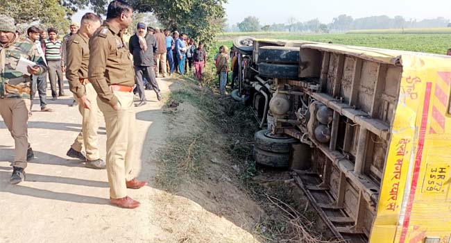 क्षेत्र के पिनेकल स्कूल की बस गांव मोहम्मदपुर मई से नौलीहरनाथपुर मार्ग पर स्कूली बच्चों को लेकर वापस आ रही थी। चालक अरविंद बस को चला रहा था। इसी दौरान अचानक बस अनियंत्रित होकर गांव मोहम्मदपुर मई और बाकरपुर के बीच सड़क किनारे पलट गई। तेज आवाज सुनकर आसपास खेतों पर काम कर रहे ग्रामीण घटनास्थल की ओर दौड़ पड़े। ग्रामीणों ने बमुश्किल बस में फंसे बच्चों को बाहर निकाला।
