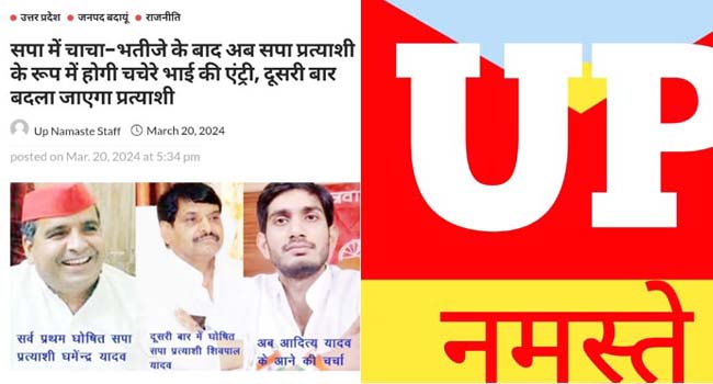 यूपी नमस्ते ने गत बीस मार्च को अपनी खबर चाचा-भतीजे के बाद बदायूं में चचेरे भाई की एंट्री शीर्षक से खबर को प्रकाशित किया था जो अब पूरी तरह से सच साबित हो गई है और सपा ने भी आदित्य यादव को बदायूं से चुनाव लड़ाने का ऐलान कर दिया है। आदित्य की उम्मीदवारी को लेकर शिवपाल ने भी पुष्टि करते हुए कहा हैं कि बदायूं की जनता को युवा उम्मीदवार की जरूरत है जिससे आदित्य को सपा से मैदान में उतारा गया है। इससे पूर्व मंे भी यूपी नमस्ते राजनैतिक एवं सामाजिक स्तर पर सटीक खबरों को प्रकाशित किया था जो सभी सत्य साबित हुई।