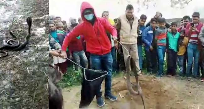 बदायूं। जनपद के ब्लाक कादरचौक के गांव सकरी में बीते शाम निकले कोबरा नाग-नागिन के जोड़े को बदायूं निवासी विकेन्द्र शर्मा ने ग्रामीणों के कोप से बचा कर उन्हें सुरक्षित पकड़ने के बाद जंगल में छोड़ दिया। श्री शर्मा ने सांप के जोड़े को बचाने के लिए पुलिस की मदद ली और कब्र के अंदर घुस को नागिन को सुरक्षित निकाला।