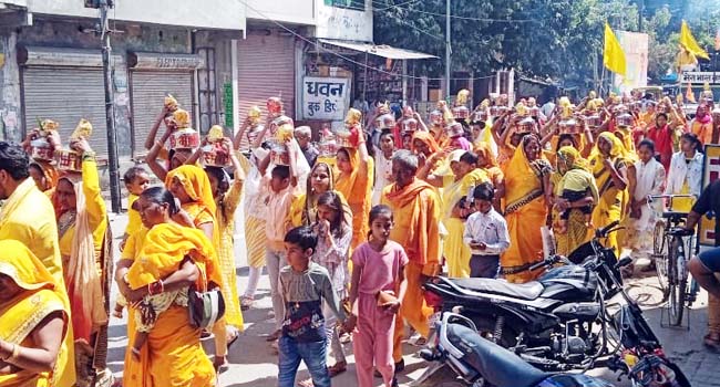 उझानी(बदायूं)। अखिल विश्व गायत्री परिवार के तत्वावधान में पांच कुंडीय गायत्री महायज्ञ एवं प्रज्ञा पुराण कथा का भव्य कलश यात्रा के साथ शुभारंभ हुआ। पीतवस्त्र धारी मातृशक्तियों और देवकन्याओं ने सिर पर कलश धारण कर नगर के मुख्य मार्गों से कलश यात्रा निकाली। गायत्री परिजन नत्थू लाल शर्मा, भवेश शर्मा और पंकज कुमार ने वेदमंत्रोच्चारण कर शक्ति कलश का पूजन कराया।