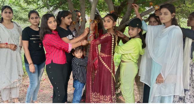 महिलाओं ने पेड़ पौधों के रक्षा सूत्र (राखी) बांध कर की उनके दीर्धायु की कामना, पेड़ पौधों को बताया मानव जीवन और प्रकृति का साथी