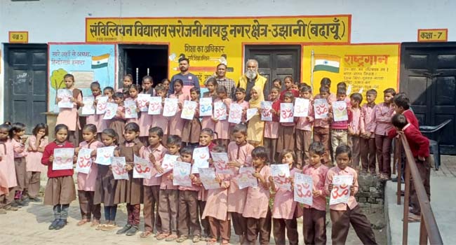 उझानी(बदायूं)। संविलियन सरोजनी नायडू प्राथमिक विद्यालय में परमात्मा की ओर एक कदम टीम की तरफ से निशानी निरंजन नाम में रंग भरो प्रतियोगिता कराई गयी जिसमें स्कूली बच्चों ने ओम शब्द में सुन्दर तरीके से रंग भर कर सभी का मननमोह लिया।